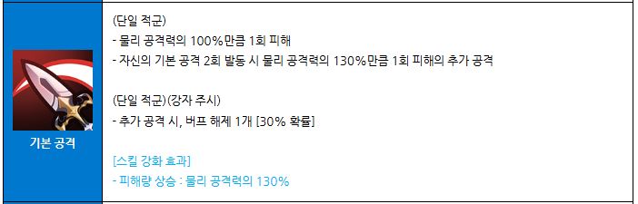 기본 공격 2회 발동 시에는 물리 공격력의 130%만큼 추가 공격이 터집니다.