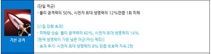 단일 적군에게 물리 공격력과 시전자 최대 생명력에 비례한 피해를 줍니다.