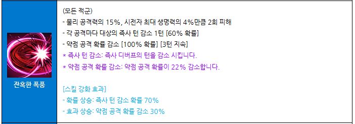 100% 확률로 약점 공격 확률을 3턴간 22% 감소시켜 적군의 딜링 능력을 크게 저하시킵니다.
