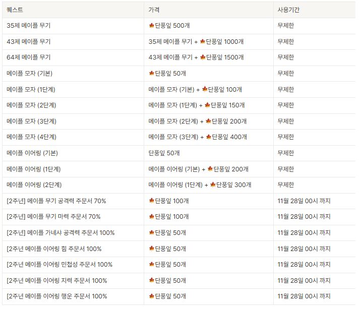 이번 2주년 이벤트는 단풍잎을 테마로 한 다양한 퀘스트와 상점,