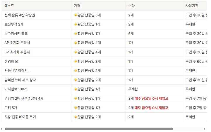 황금 단풍잎을 모아 슬롯 확장권, 초기화 주문서, 생명의 물 등 유용한 아이템으로 교환할 수 있고