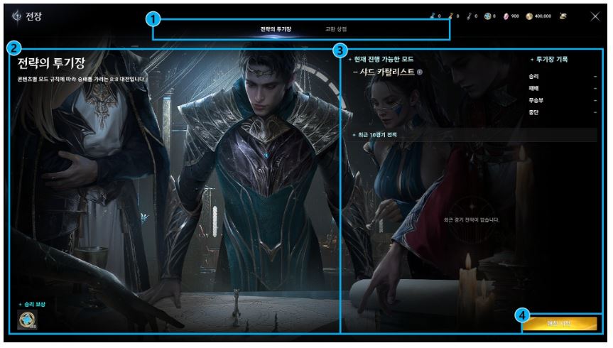 투기장은 1vs1 고독의 투기장과 4vs4 협력의 투기장으로 구성된 매칭형 PvP 콘텐츠입니다.