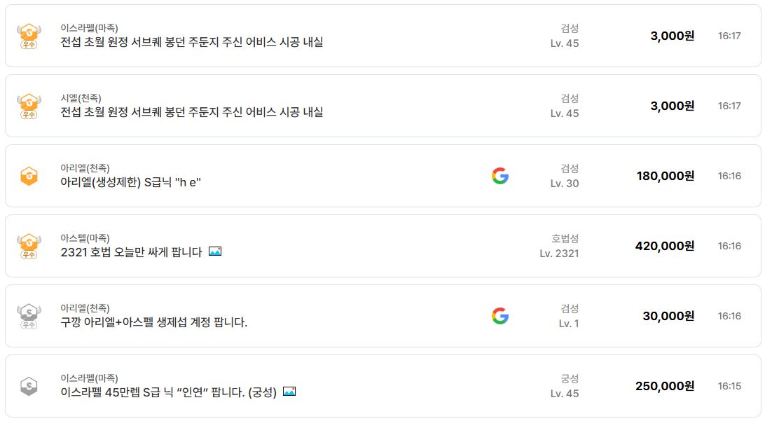 만렙 캐릭터 계정은 기본이고 고가치 아이템 매물도 쏟아져 나오더라고요.