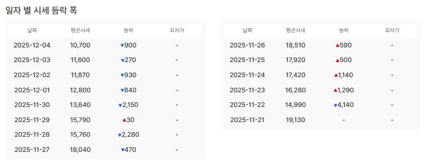 11월 27일 18,040원이던 평균 시세가 12월 4일에는 10,700원으로 급락했습니다.