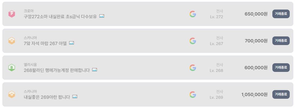 거래 종료 내역을 보면 267~269 레벨 전사 계정이 60만 원대에서