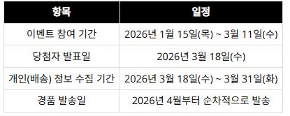 이벤트 참여 기간은 2026년 1월 15일부터 3월 11일까지로 비교적 여유 있게 운영됩니다.
