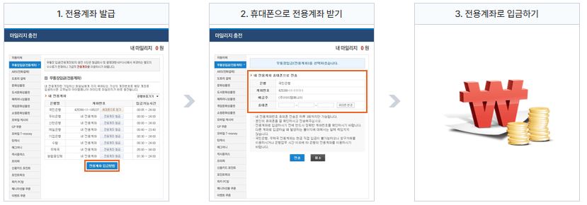 해당 계좌로 입금하면 별도 절차 없이 마일리지로 바로 반영되는 방식입니다.